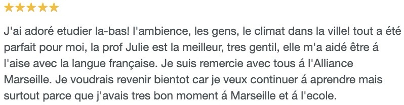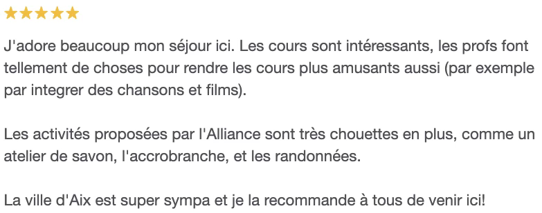 Avoir étudié à l’Alliance Française Aix-Marseille Provence, reconnue dans plus de 130 pays, constitue un gage de sérieux et de qualité linguistique.